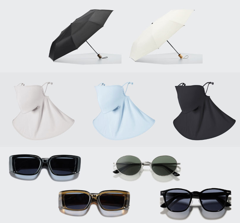 ユニクロの「UVカットコレクション」ラインナップがさらに拡充! UVカット傘やフェイスカバー、サングラスなど、身に着けるだけで紫外線を90%以上カットするアイテムが豊富に揃い、夏の日射し対策をサポートしてくれます。
