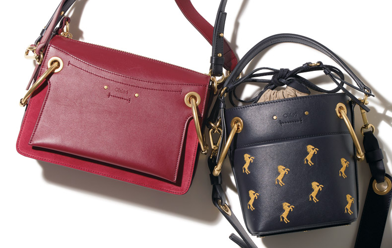 バッグ・右/〝クロエ〟を象徴するモチーフのホースを刺しゅうしたレトロなデザイン。キャンバス地の巾着付き。[17×14.5×9]¥195,000・左/カーフとスエードのMIX使いがリッチ。小ぶりながらも長財布が入り使いやすさも◎。[18.5×25×11]¥209,000(クロエ カスタマーリレーションズ〈クロエ〉)