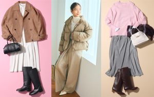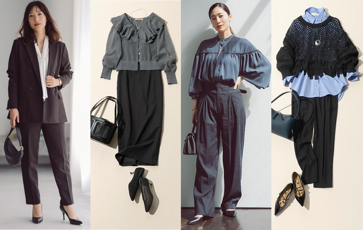 白やグレー、明るいブラウンなど優しげな色味でまとめたコーデは、黒小物でかっちり締めてオンモードに。