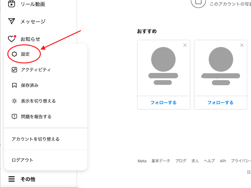 1.パソコン版のインスタにアクセスしてログインし、ホーム画面左下の「その他」をクリックする