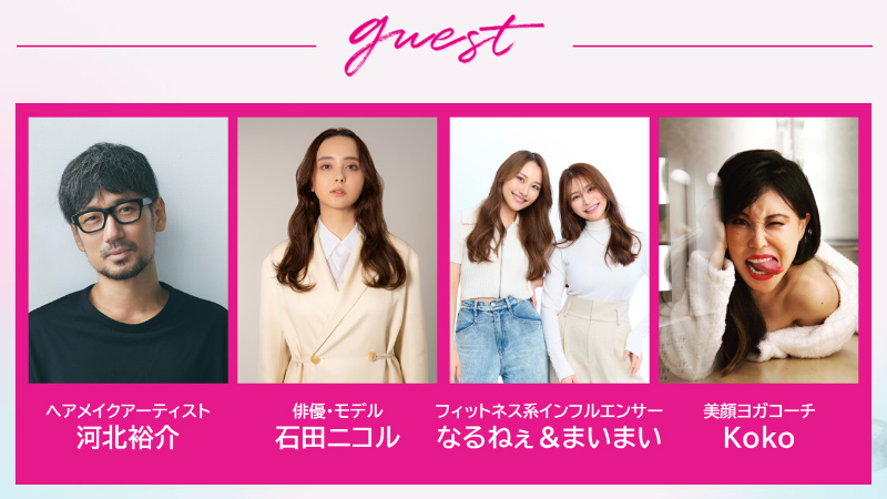 ヘアメイクアーティスト・河北裕介さんによるメイクショーや、フィットネス系インフルエンサー・なるねぇ&まいまいのフィットネス体験会も実施。石田ニコルさんや谷川りさこさん、アメリカでも話題の美顔ヨガコーチ・Kokoさんといったスペシャルゲストも登壇します。