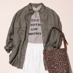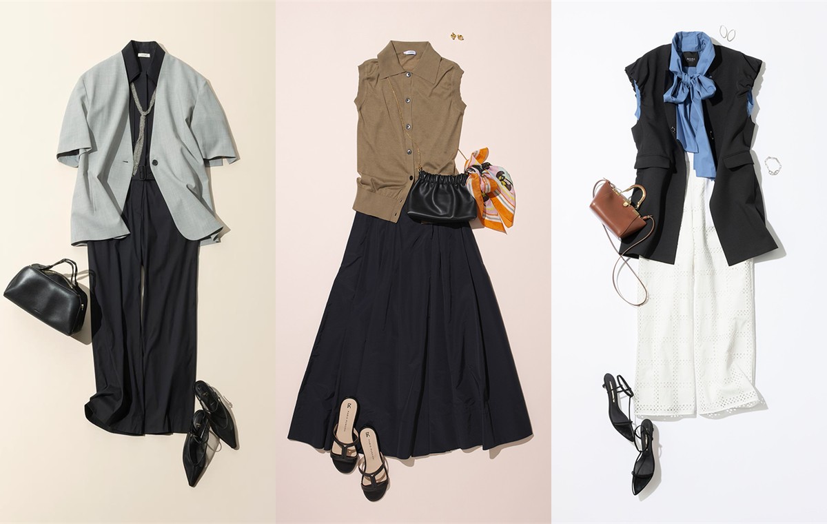 白シャツ×グレーパンツのきれいめな組み合わせ。気張らずきちんと見せたい日は、涼しげなリネンのシャツで大人のカジュアル感をプラスして。パンツの面積が広いぶん、ネイビータンクからチラリと肌を覗かせて夏らしい抜け感をオン。小物は上品なグレージュで揃え、オフィスになじむバランスに。