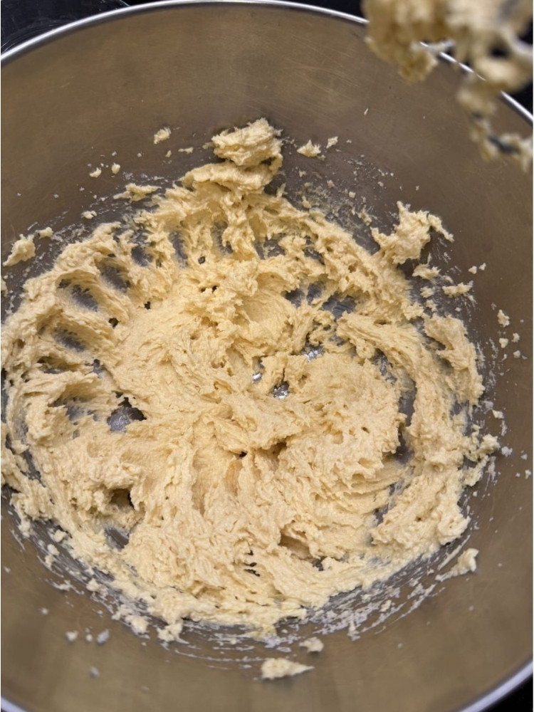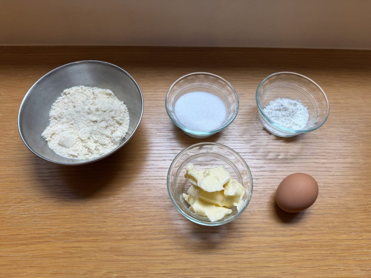 4.アーモンドクリームを作ります。室温に戻したバターと砂糖を撹拌した後、卵を加え、さらによく混ぜ合わせます。最後にアーモンドパウダーとコーンスターチを加えて混ぜ合わせれば、完成。