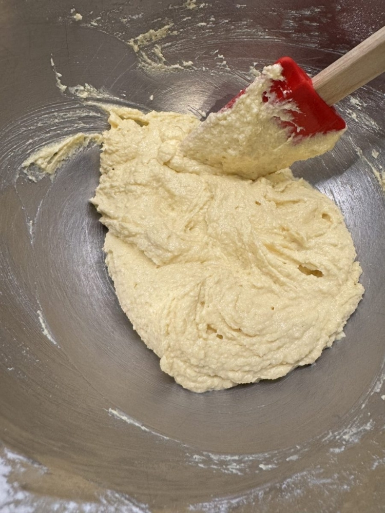 2.卵を少しずつ加えます。加える度に、[1]の生地と分離しないようにしっかり撹拌します。