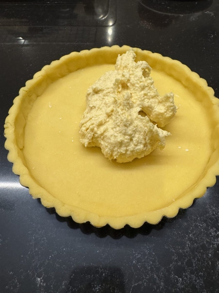 5.[3]の生地に、[4]のアーモンドクリームを乗せて、平らにならします。
