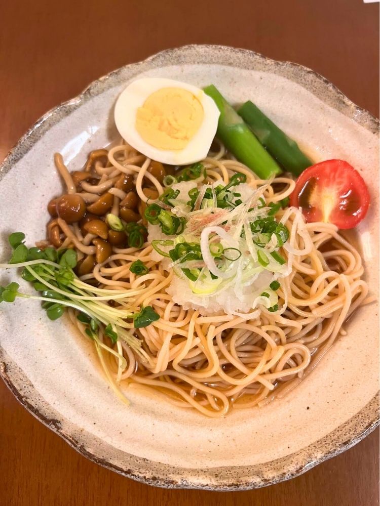 最近は暑い日も多くなってきたので、大根おろしやなめこなどを乗せてさっぱりと「なめこおろしそば風」でいただきました。市販のパスタと同じく電子レンジ調理器で茹でられるため、忙しいときでも効率よくご飯の準備ができます。