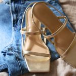 ベーシックなコーデにモードなエッセンスをプラスしてくれるゴールドサンダル。デニムパンツのカーヴィラインが今っぽさを演出。