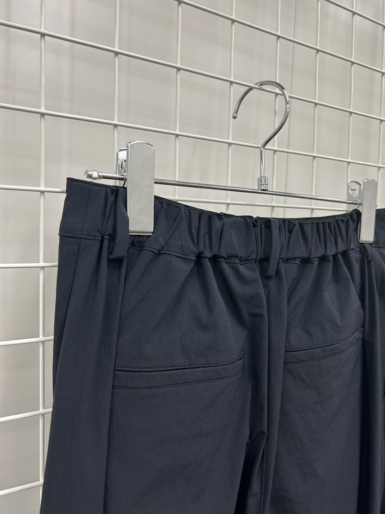 軽やかなシャカシャカ素材が涼しげ! カジュアルめな素材ながら、微光沢のサテンと深めのネイビーが上品で通勤にも使いやすい。太めのシルエットに加え膝にドレープが入っているため、脚のラインを拾いにくく大人にもはきやすいデザインです。撥水機能にも優れているため、水辺のレジャーにもおすすめ。パンツ¥28,600(フィルム<ダブルスタンダードクロージング>)
