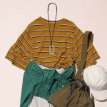 デニムを合わせがちなボーダーTシャツは、脚長効果も期待できる涼しげなパンツで大人のバランスに。腰に巻いたグリーンのシャツは差し色の役割をこなすほか、冷房・紫外線対策もできるお役立ちアイテム。マスタードカラー、ベージュ、グリーン…と色数が多くてもまとまりがいいのは、アースカラーで統一した配色のおかげ。