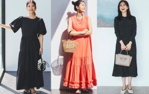 ゆるやかに広がるマキシ丈のノースリワンピに、ほのかな透け感が涼しげで、気になる二の腕もさりげなくカバーするクロップドカーデをはおったスタイル。フレッシュなライムカラーのシアーカーデがメリハリをつけてくれる着こなしです。短丈なので、さらっとはおるだけで軽やかに仕上がるのも魅力。ストロー素材のクラッチでカジュアルにこなして。