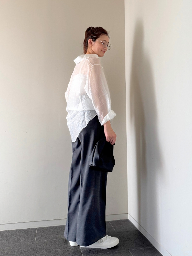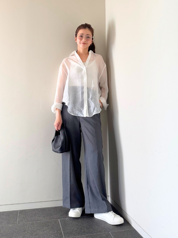 グレーのパンツできちんと感とやわらかさを、そして、白スニーカーで爽やかさを出しました。透け感が適度なのでいやらしくならず、日焼けと寒さ対策にも長袖は必須ということで、シアーシャツがうってつけのシチュエーションでした。