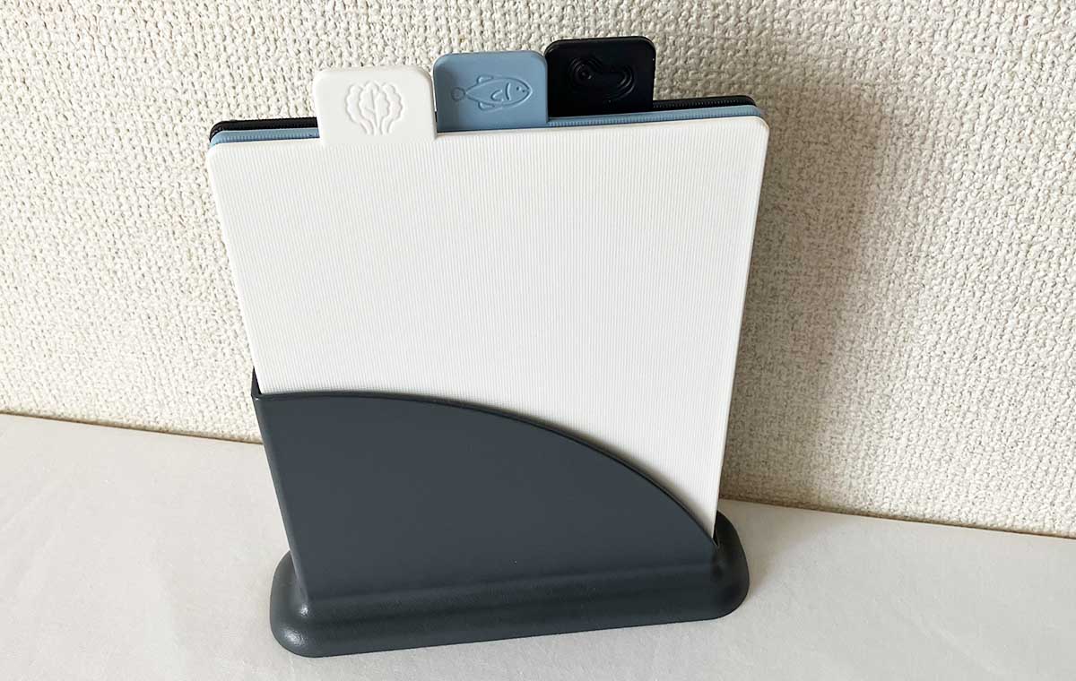 3つのまな板を使い終わったら、スタンドに片付けます。コンパクトなので、場所をあまり取らずに置けそう。