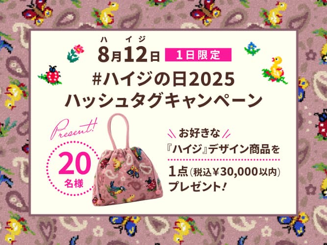 8月12日(火)0:00~23:59の1日限定で、ハッシュタグキャンペーンを開催。お気に入りの写真を「#フェイラー」「#ハイジの日2025」の2つのハッシュタグをつけて、インスタグラムもしくはXに投稿した方の中から、選考で20名に、お好きな「ハイジ」デザイン商品を1点(税込¥30,000以内)プレゼントします。詳細は特設ページをチェックして。