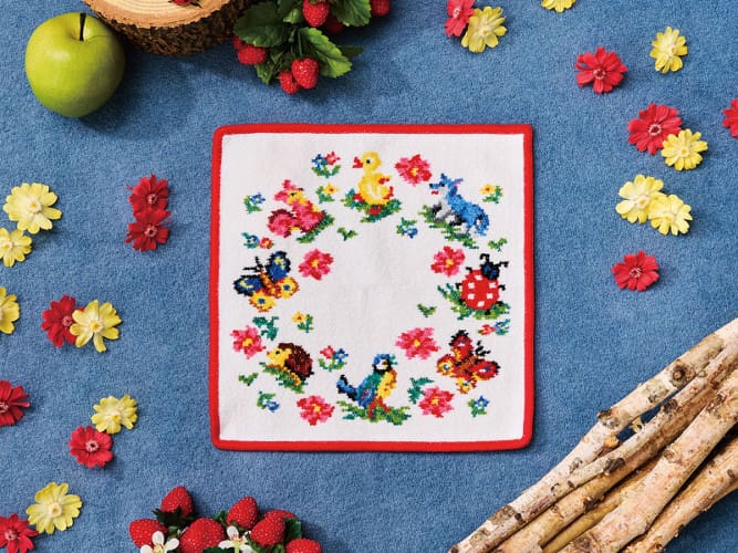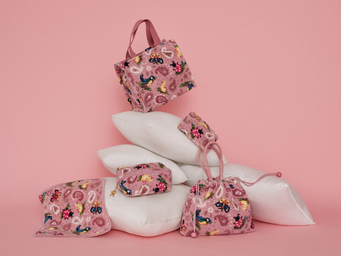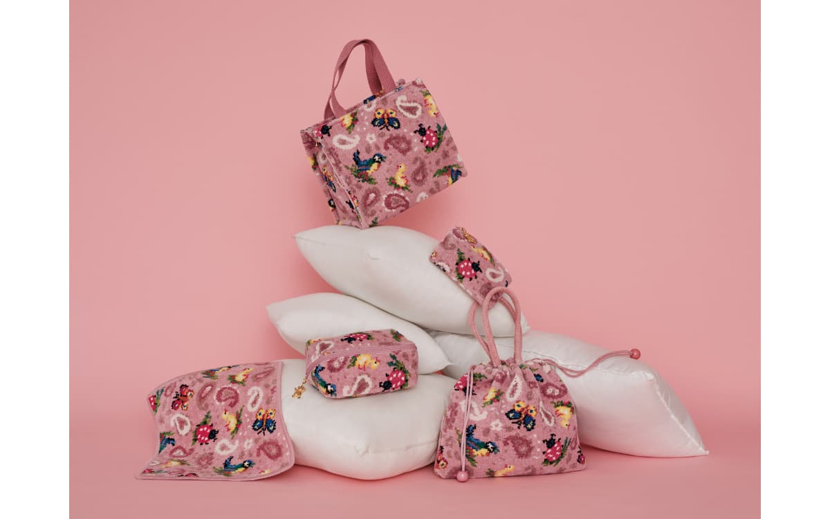 てんとう虫にちょうちょ、小鳥たち、そして小さな花が織りなす「ハイジ」柄に、ペイズリーを組み合わせた華やかなデザイン。定番のシュニール織アイテムからメッシュポーチまで、多彩なアイテムで展開します。