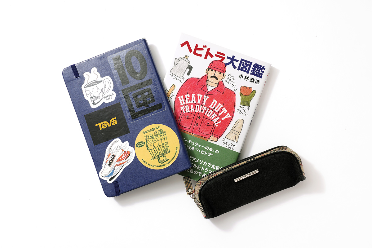 「2025年はもっと本を読みたい! と思って一冊は持ち歩くように。冬にヘビーデューティな格好が気分だったこともあり、この日は小林泰彦さんの『ヘビトラ大図鑑』を読んでいました。 新入社員のときに先輩社員から、『紙とペンはどんなときでも持ち歩け!』と言われて以来、欠かさずバッグに入れているノート。もらったものや好きなステッカーをペタペタ貼ってアレンジしています。ペンケースは20年選手。中学生のころに従姉からお下がりでもらった、青春時代を共に過ごしたアイテムです」