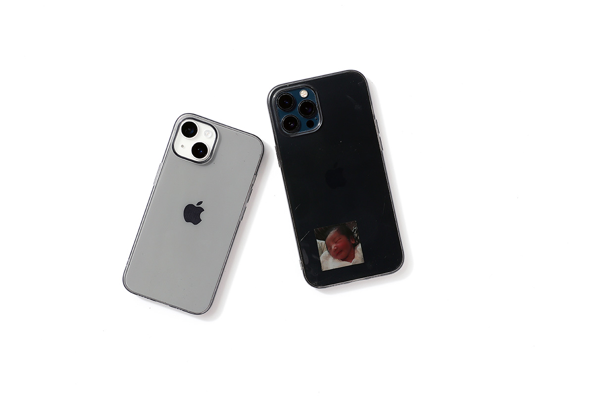 「プライベート用はiPhone 12 Pro Max。そろそろ買い替えたいと思いつつ、まだまだ使えるので買い替えタイミングは新機種次第。息子の生まれたばかりのころの写真をずっと入れています。社用はiPhone 14。ケースは同じもので楽天で300円くらいで買いました。無色透明だと黄ばみが気になるのでややグレーの色味をチョイス」