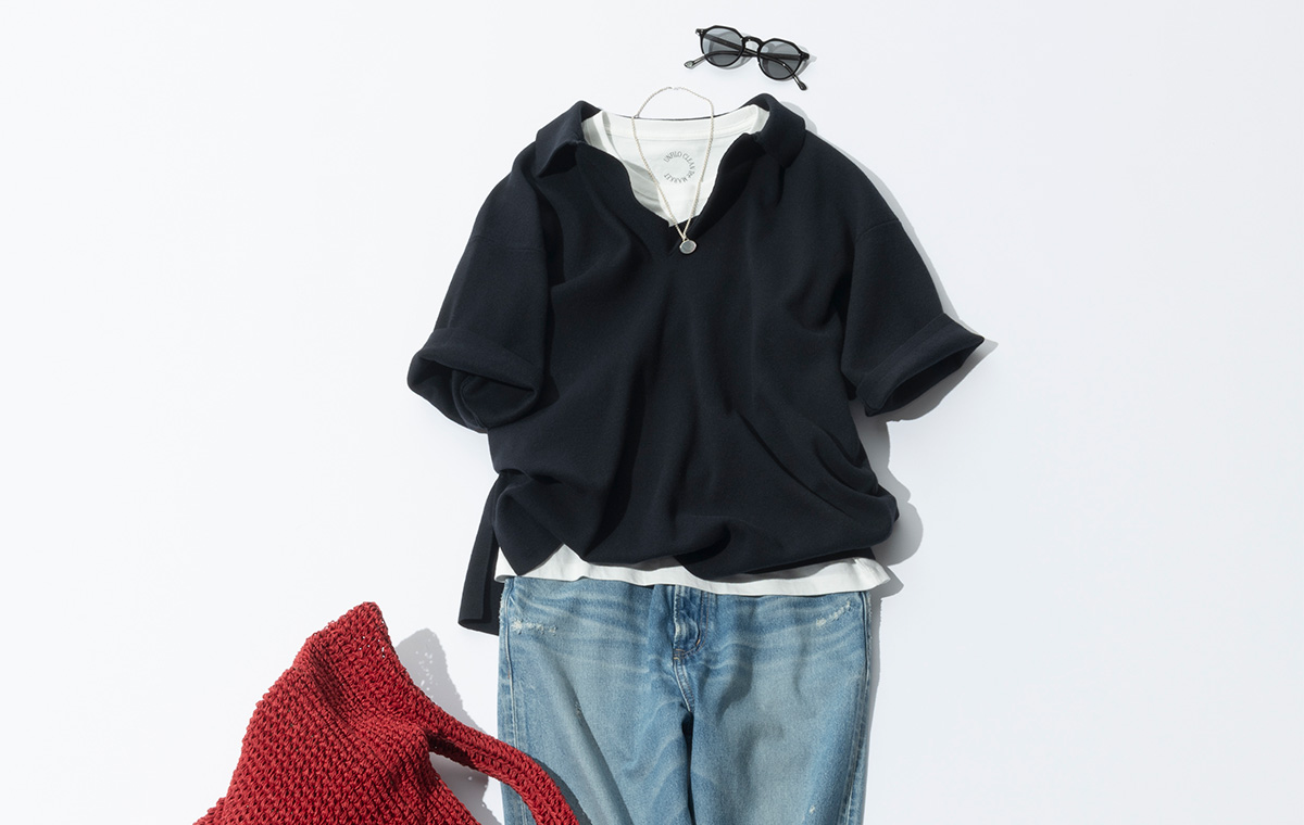 はき込んだようなウォッシュや裾のほつれ具合が本格的なヴィンテージ風デニムは、ゆったりストレートのやや重ためシルエットが今っぽい。ネイビーのポロニットの中には白Tを重ね、王道カジュアルを涼し気にセンスアップ。デニムの色味と部分的に効かせた白も夏らしい爽やかさに直結。