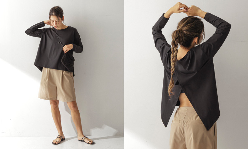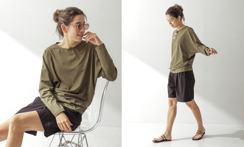 ゆったりとしたシルエットとやや広めに開いたネックラインでリラックス感のあるデザインに。着丈を長めに設定し、裾がフィットするサイズ感にすることで、腰が隠れる位置からウエスト位置まで丈感の調節が可能です。