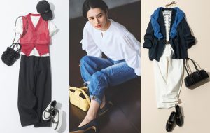 小ワザが効いていてちょっと攻めている印象がありつつ、働くママにはありがたい品の良さも感じられる理想的なジレ。ゆったりめの白Tとカーヴィデニムに合わせるだけで、抜群の洒落見えを実現。