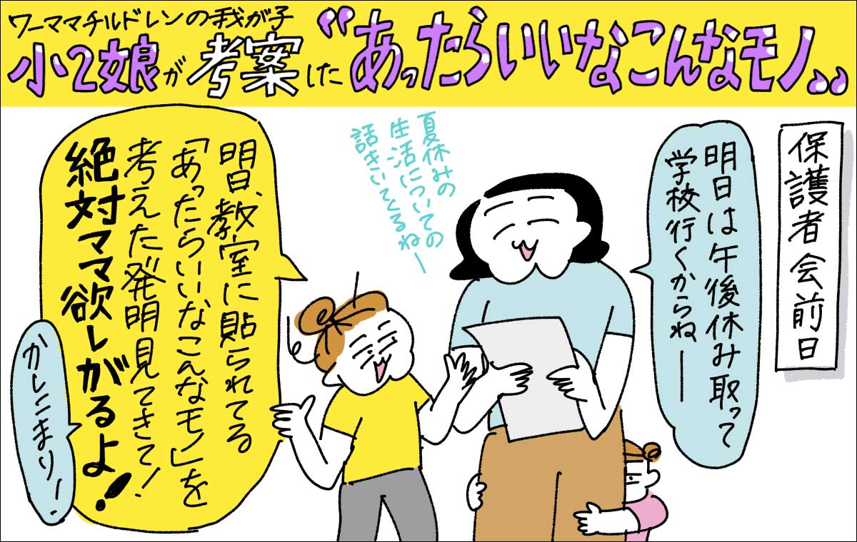 毎日バタバタしている母を見ているせいか、子供の『あったらいいな』の発明品がとてつもなくママ思いなアイテムだったというお話です。
