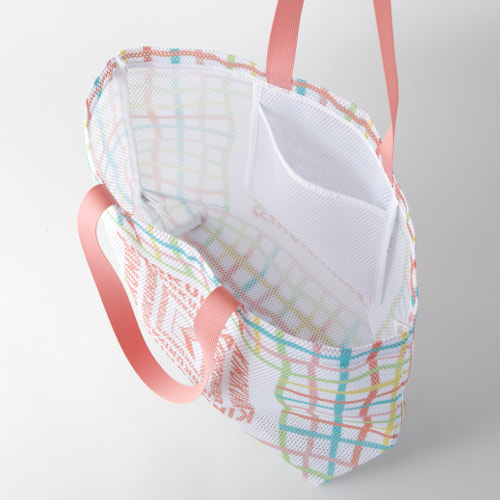 涼し気なメッシュ素材にライトブルーはストライプ柄、ピンクはチェック柄をあしらった大容量トート。軽くて通気性抜群なので、水辺やジムでの使用に、またランドリーバッグとしてもおすすめです。小さく折り畳めるので使わない時も収納場所を問わず、旅行やお出かけの際のサブバッグとしても活躍します。
