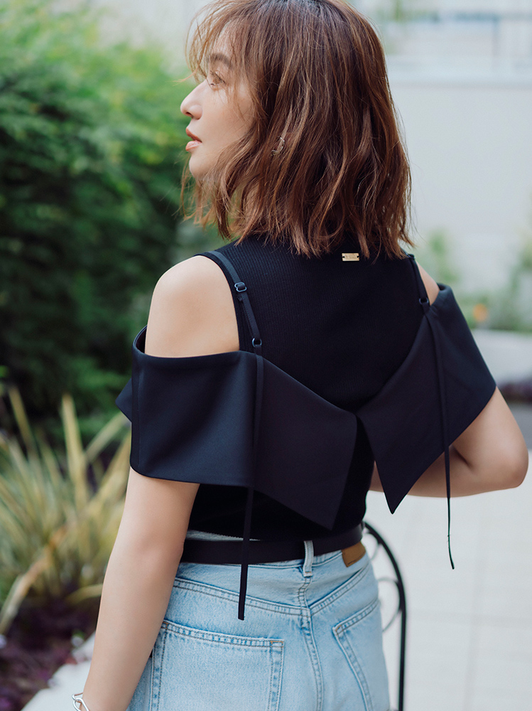 程よくカジュアルでフェミニンな、ニットのタンクトップに異素材のアシメトリーなビッグカラーが華やかなトップス。肩の肌見せがヘルシーな色気を感じさせて。それだけで十分映えるので、ボトムはベルトでウエストマークしたカーヴィデニムでカジュアルダウン。