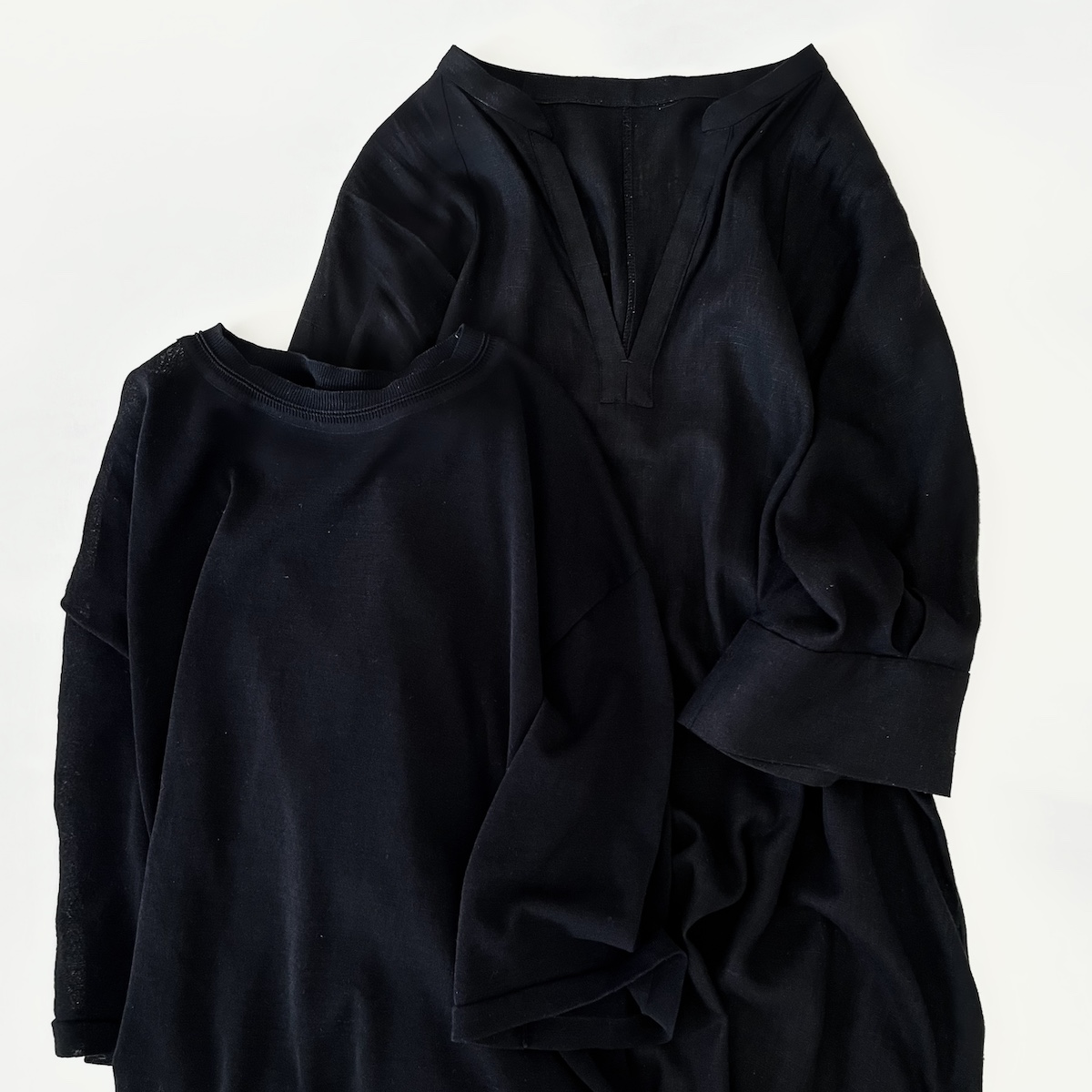 まずは、どちらも黒。ひとつは五分そでのクルーネックニットで、ひとつはラグランスリーブのロングワンピースなのですが、基本的にシンプルで、手持ちのワードローブから大きくかけ離れることはありません。いやむしろ「すでにもっているのでは……」という疑問すらわきます(セールあるある)。ただし、一見ベーシックではあるものの、どちらも気の利いたデザインになっていて、それが購入を決めた理由でした。