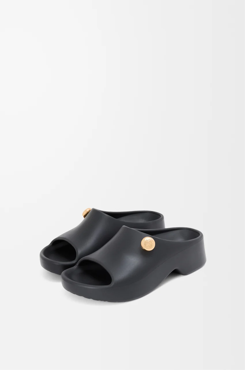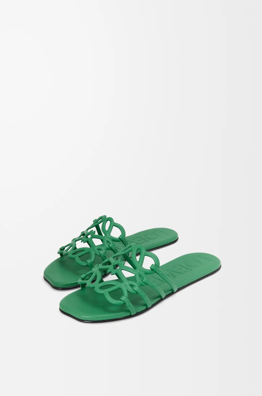 ソフトカーフスキンを使ったスライドサンダル。アッパーにはアナグラムのカットワークやハンドステッチがあしらわれ、インソールにはクッション入りレザーとロエベのエンボスロゴが施されています。