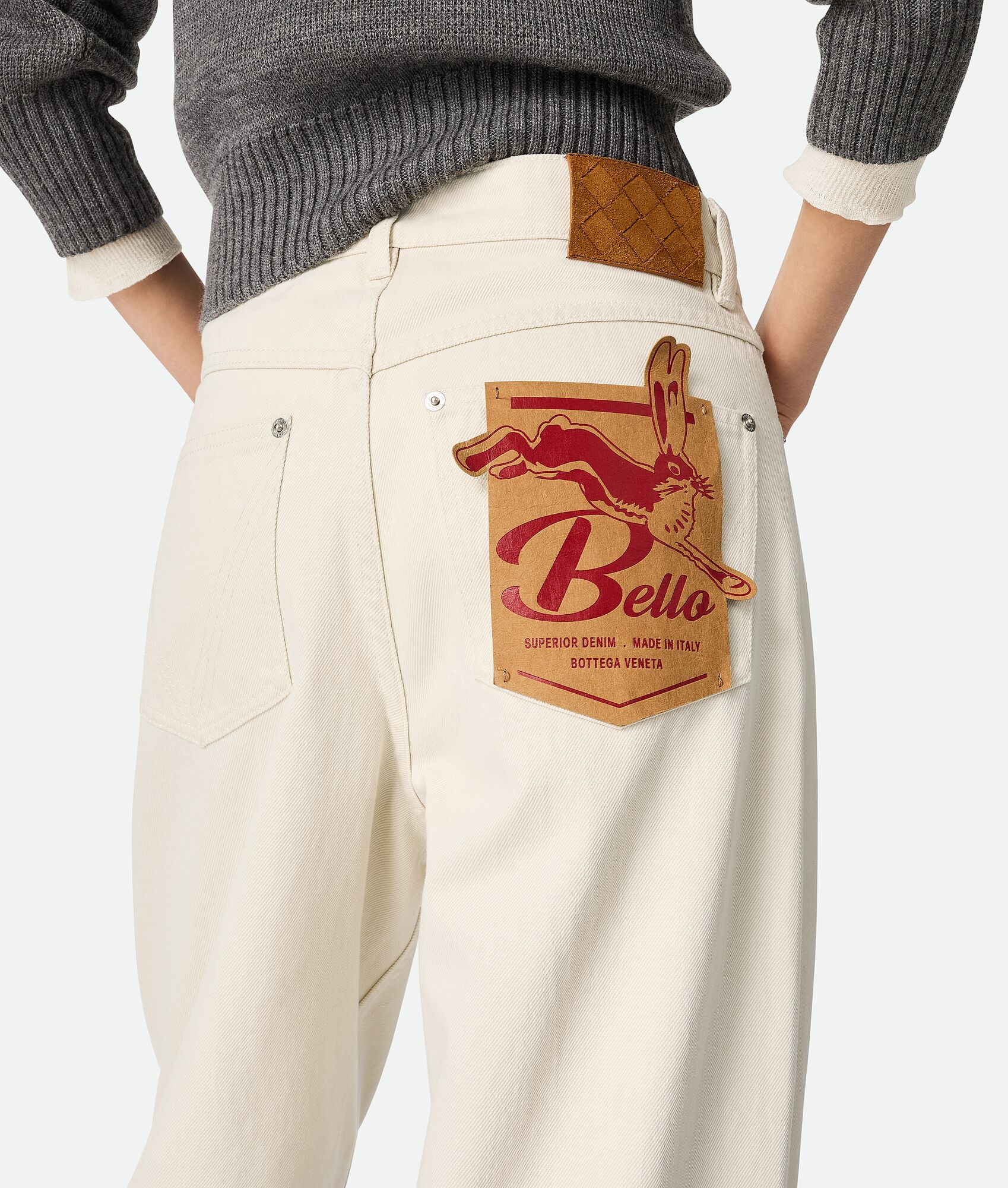オプティカルホワイトのストレッチデニム製ブーツカットジーンズ。英国のキャサリン妃も愛用する脚長シルエットで、上品な佇まいが特徴です。