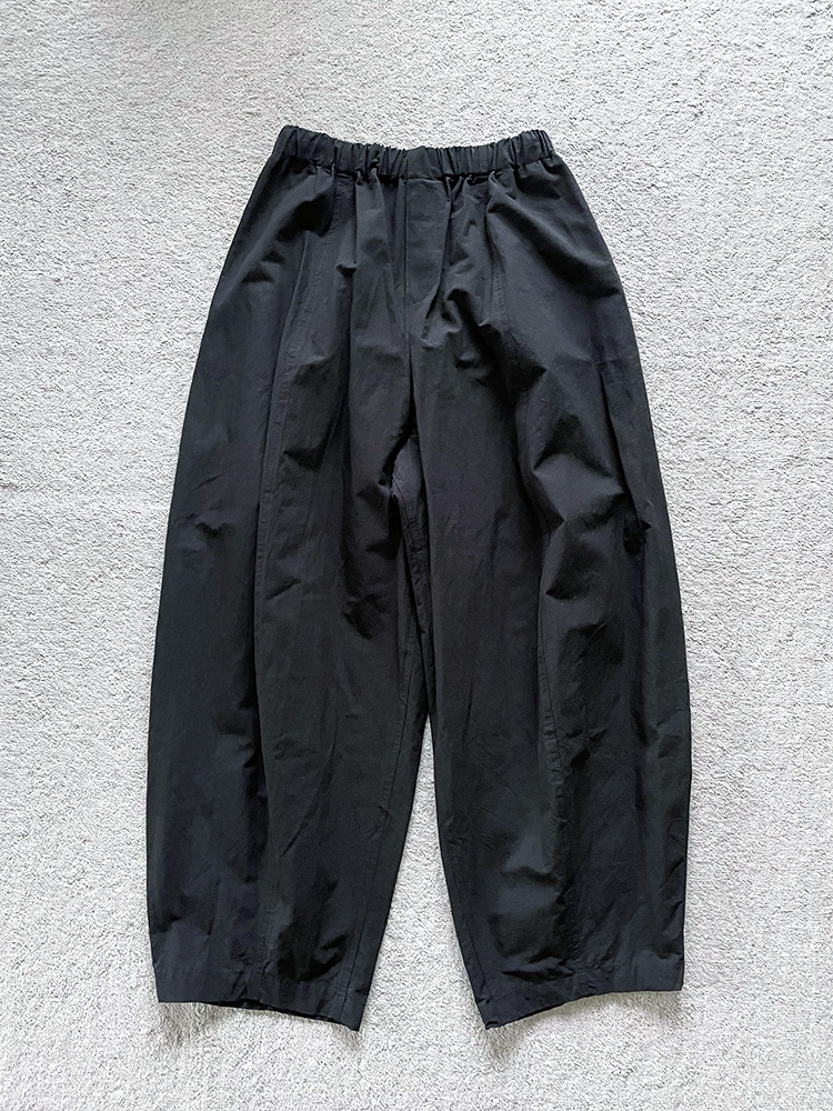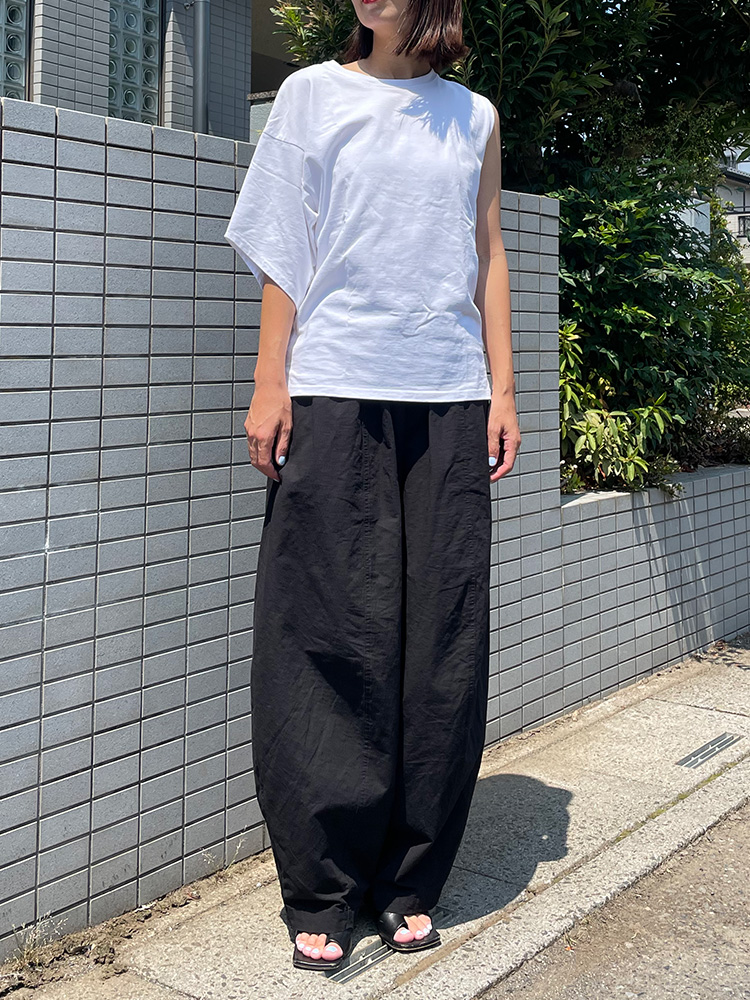 Tシャツも大体が無彩色の私。ベーシックな黒パンツではちょっと物足りなく感じる無地T合わせですが、このパンツなら今っぽいムードを引き寄せてくれる心強さがあって、裾アウトでラフに着てもだらしなく見えません。ウエストはゴム仕様でタックインしてもすっきり。