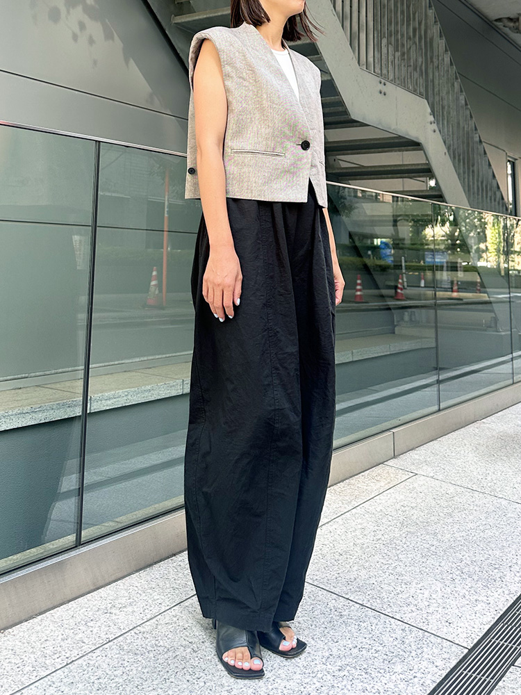 見ての通り、かなりのワイドシルエットで裾がつぼまっているバレル型。リネン混ならではのシボの風合いもこの時期にぴったりですが、ハリのあるドライな生地がほっこり見えず、極太シルエットも相まってモードに転ばせてくれる一本です。このボリューム感ゆえ、空気をはらんでくれるような感覚で、猛暑日も肌にはりつくことなく快適なはき心地! たくさん汗をかいても自宅で洗えていつも清潔が保てます。
