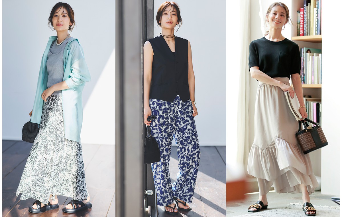 女性らしい柄に黒小物で少し辛口要素を入れるのが大人っぽコーデのポイント。さらりとした質感のブラウスやサテンスカートは素材が軽やかなので、サンダルで重厚感をもたせてバランスをとって。