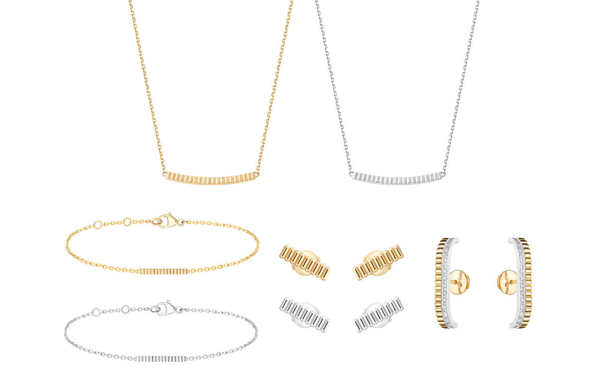 もともとクチュールやリボンなどに使用される平織りの絹織物を指す「グログラン」は、繊細でしなやかな、まるで高級生地のようなジュエリー。今回新たなクリエイションとして、イエローゴールドとホワイトゴールドのネックレス、ブレスレット、繊細なスタッズイヤリングが加わりました。