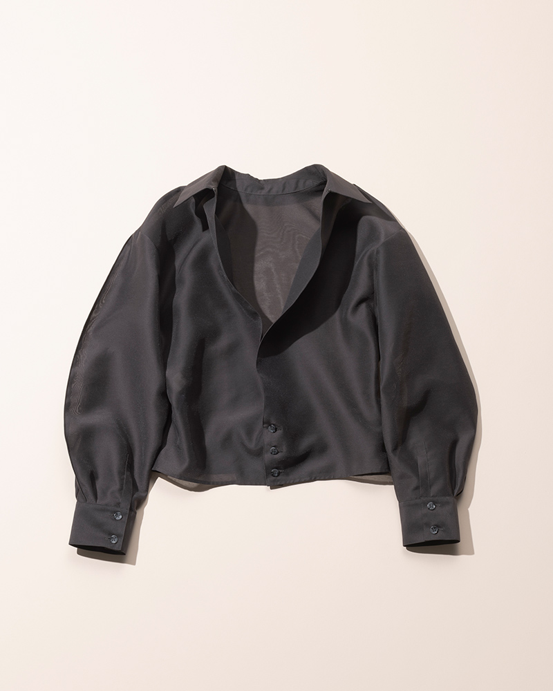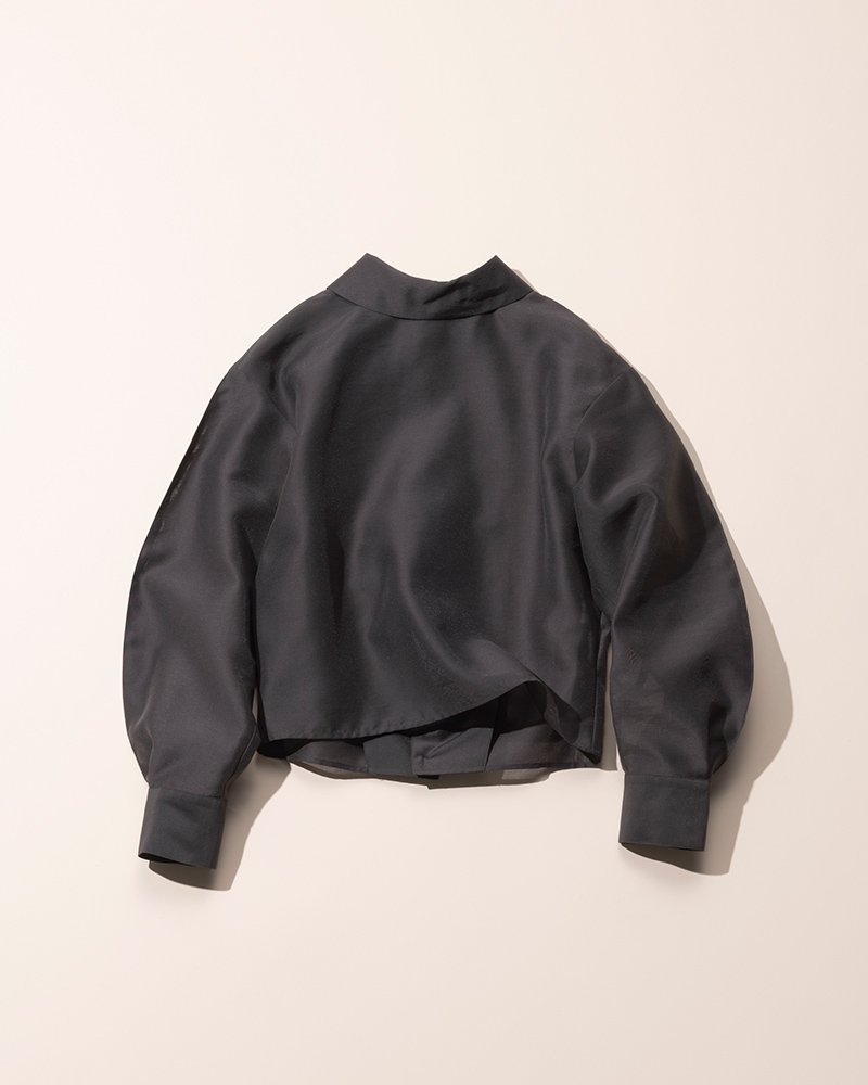 ハリと光沢のあるオーガンジーがリッチに映え、たっぷりとボリュームのある袖がフェミニン。前後2WAYで、シャツのフロントを開けラフに着こなすほか、ハイネックブラウスとしてレディに着こなすなど幅広く楽しめる1枚。