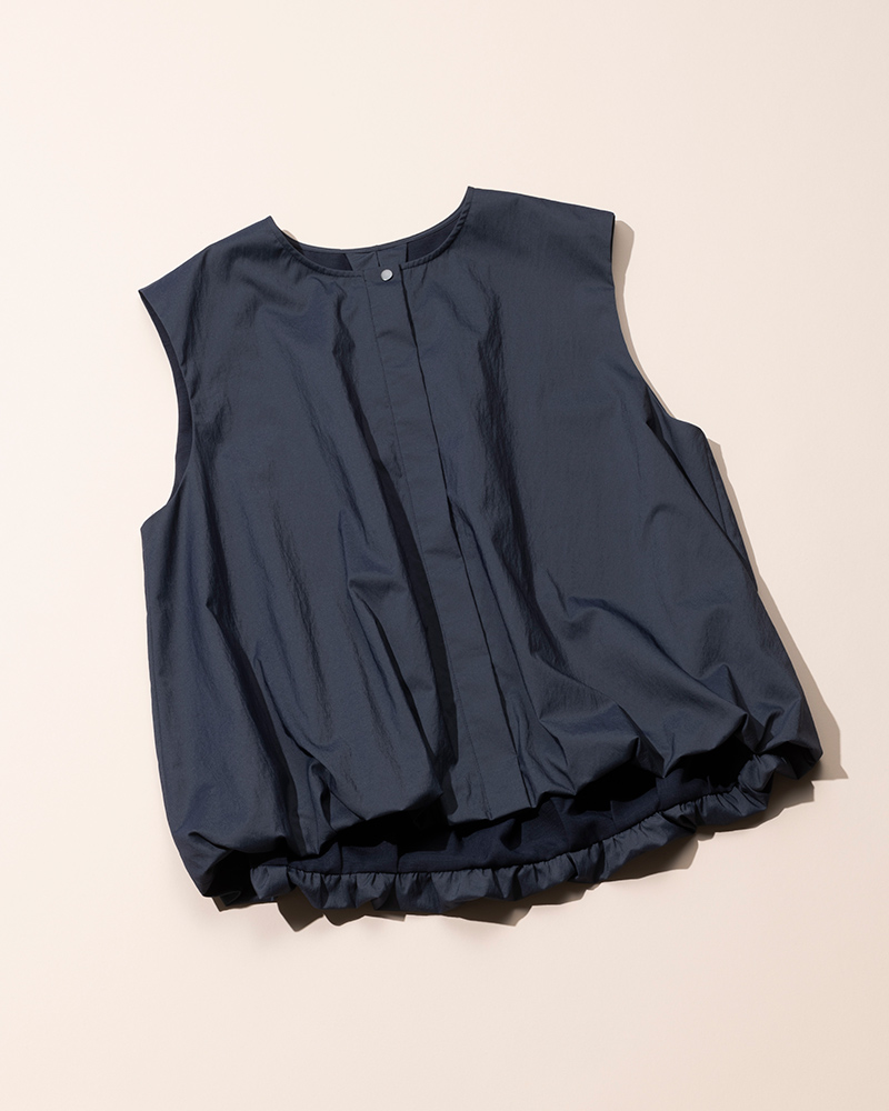 サラッとしたタッチと落ち着いた光沢感が魅力のジレブルゾン。前後差丈のバルーンシルエットが絶妙なボリューム感でシンプルボトムとも好相性。シワになりにくく手洗いOKなので、旅行の際の軽い羽織にも便利。