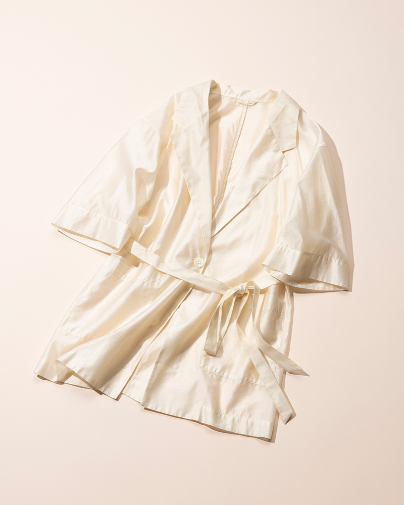 きちんと感のあるテーラードで、オーバーサイズとハーフスリーブの抜け感が1枚で今どきの洒落感を演出。共布ベルトでウエストマークすればフェミニンに、または袖を折り返してシャツっぽくラフに羽織るのもおすすめ。