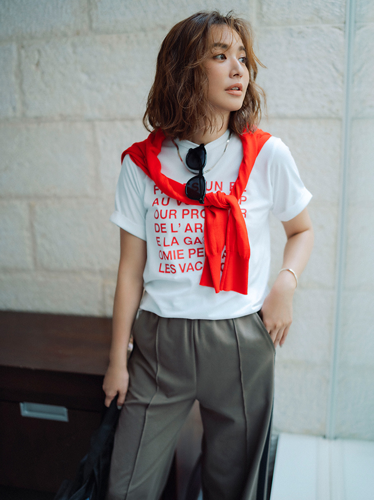 スポーティ流行りで注目のトラックパンツに白のロゴTを合わせた、シンプルカジュアルなコーデ。そこに赤いロゴと繋げるように、赤カーデの肩掛けで秋トレンドを先取りした着こなしに。人混みの中でもパッと目立つ、ある意味目印にもなる”映え”が魅力。
