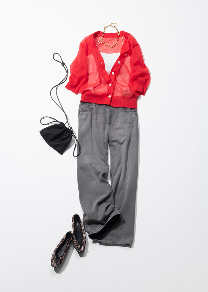 【LOOK2】軽やかなシアーなレッドカーデで、ブラックデニムをモダンに