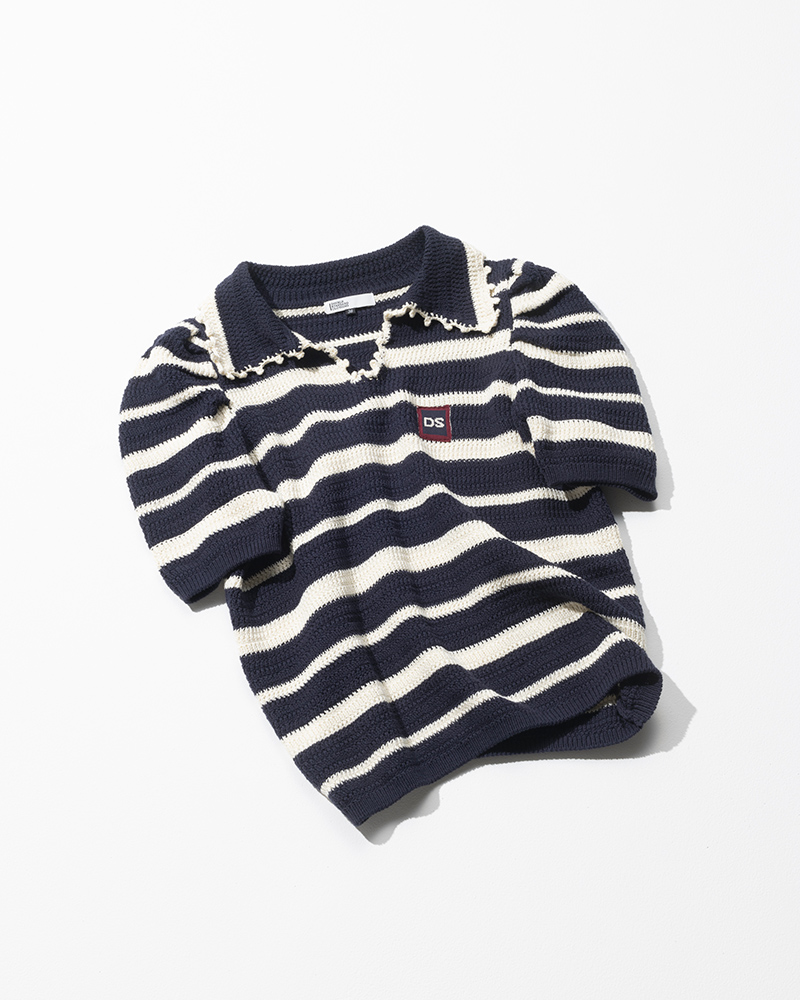 かぎ編みで仕立てられ、パフスリーブと襟周りのレースがクラシカルでフェミニン。ネイビー地が多めのボーダー柄が甘いデザインを引き締めて。胸元のロゴや、背面の小さなハートが可愛らしいアクセントに。