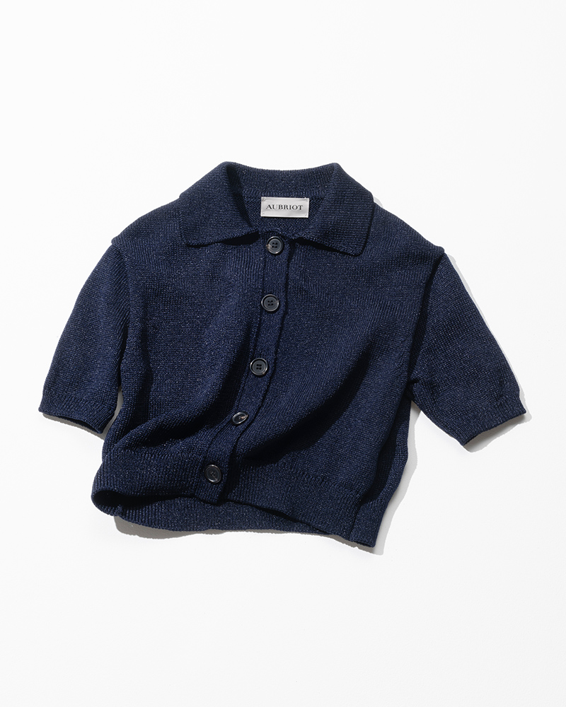 薄手のシアーニットが鮮やかなブルーを軽やかに見せ、襟と五分袖のきちんと感が大人向けのニットポロ。ボトムとのバランスがとりやすい丈感なので、ゆったりシルエットのイージーパンツに合わせ、絶妙にリラクシーな着こなしに。