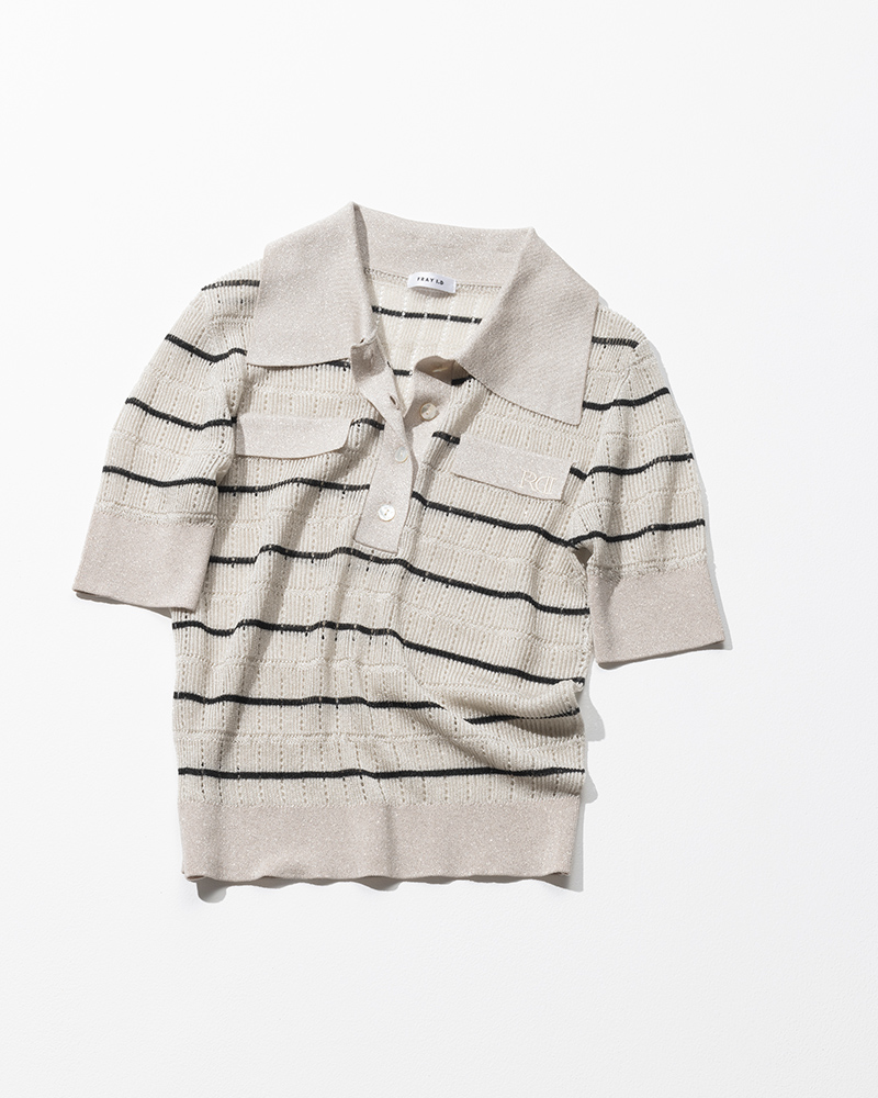 シアーな素材感と、ハトメのような透かし目の編み地=アイレット編みが印象的なニットポロ。アイボリーにモノトーンのボーダーラインがキリリと映え、涼しげなアセテート混のラメ糸なので秋口も快適な着心地。