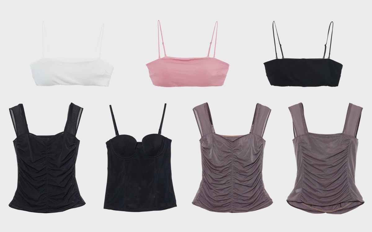 今回発売されるのは、自然なバストシルエットをサポートする「バンドゥブラ」と、適度な補整力がありながらも快適な着用感を追求した「コルセットビスチェ」。透け感のあるトップスや首元が大きく開いたアイテムのインナーとして、自分らしいスタイリングで楽しめる2アイテムです。