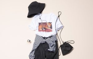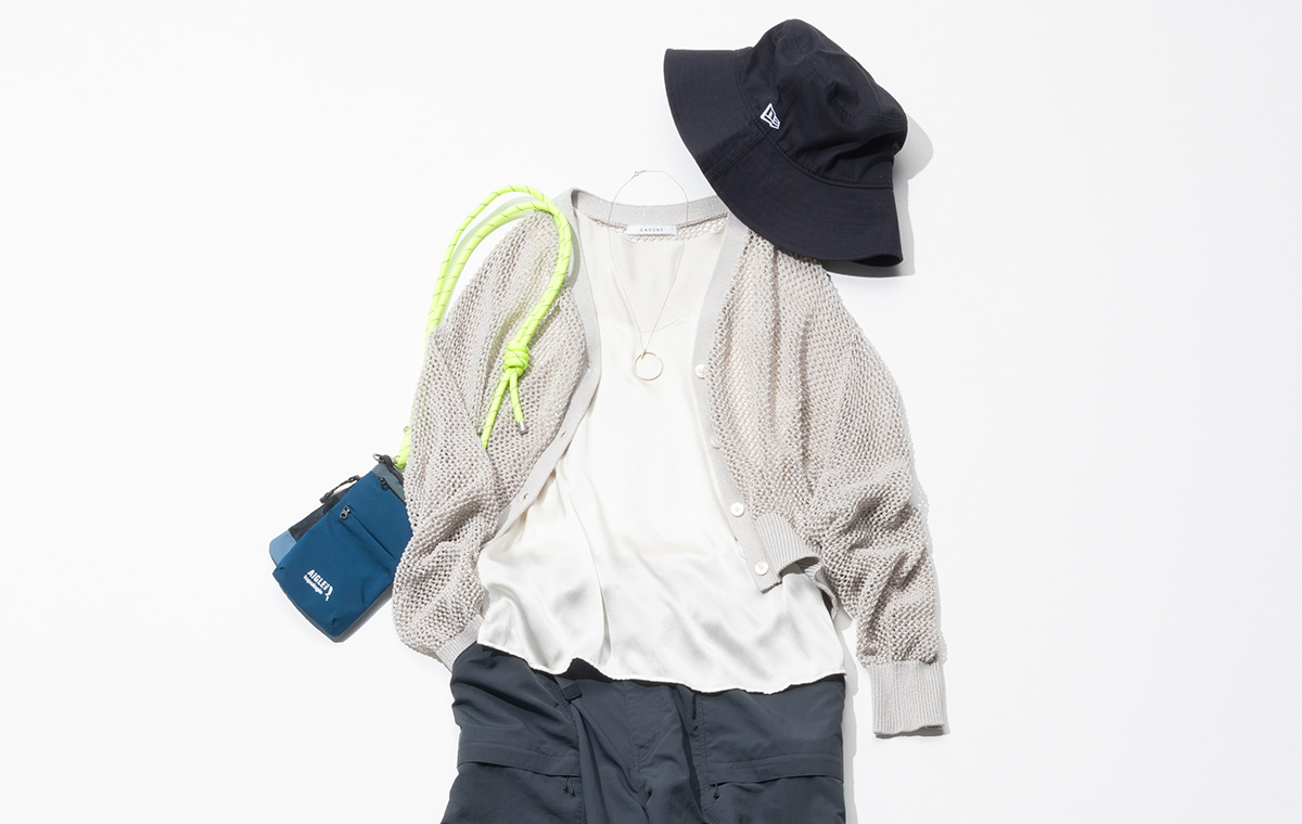 パンツ[メンズ商品]¥2,990(UNIQLO) カーディガン¥22,800(カデュネ) タンクトップ¥24,200(サードマガジン〈“THE„THIRD MAGAZINE〉) 帽子¥5,500(ニューエラ) ネックレス¥26,400(フーブス〈IRIS 47〉) バッグ¥16,500(エーグル カスタマーサービス〈AIGLE×Topologie〉) 靴¥17,600(デッカーズジャパン〈テバ〉)