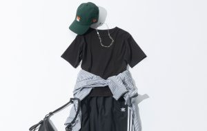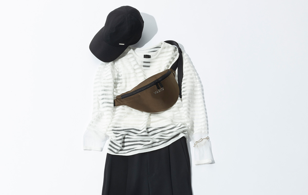 通勤定番の黒ワイドパンツ。カジュアルに傾倒するなら、トップスでひねりを効かせてアップデートを図って。タンクトップに透け感のあるボーダートップスを重ねれば、軽やかさとフェミニンなムードを纏った着こなしに。メタリックなスニーカー、艶やかなボディバッグも斜め掛けして、アクティブに仕上げて。