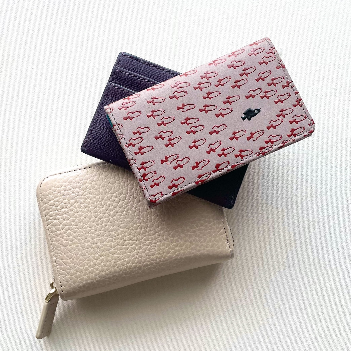 これを中心に小物をまとめたくて、お財布は、グリーンのトラ柄だったのを手持ちのアイボリーの無地に変更、I Dカードを入れているパープルのカードケースは、相性がいいのでそのままにしました。革小物って、使い続けて古くなったら買い替えるものだと思っていたけれど、手持ちのものの組み合わせを変えていくのも、なかなかよいですね。