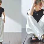 毎日のようにはきたくなるフラットサンダルこそ、ハイブランドで取り入れて。ゴールドのアナグラムペブルが華やかなボリュームサンダルは、やわらかなカーフスキンが足元を優しく包み込んで、カジュアルながら特別な存在感を放つ。コンパクトな黒Tシャツ×ワイドパンツのシンプルなモノトーンスタイルに、モードな風を吹き込んでくれる。