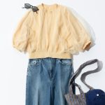 涼しいサマーニットにチュールを重ねたドルマンスリーブトップスは、明るいイエローと相まって華やかさは十分。辛口なワイドデニムパンツで甘さを引いた、「甘×カジュアル」のこなれたバランスを楽しんで。最旬のローテクスニーカーで感度の高さもさりげなくアピール。