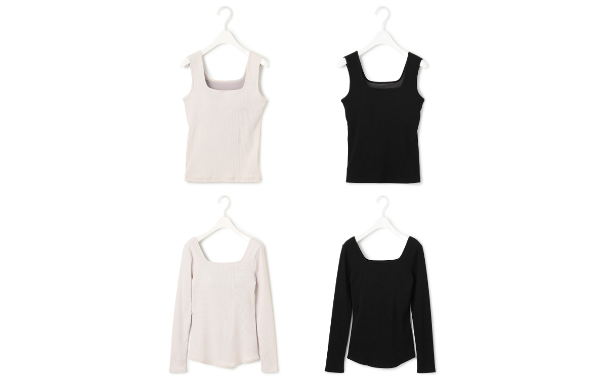 初のコラボレーションで誕生したのは、アワワコールの下着の開発技術と、ICBの働く女性に向けたデザインを融合させたカップインウェア。ベーシックなスクエアネックのタンクトップとロングTシャツにカップ構造を組み合わせ、快適さと着こなしやすさを両立させました。