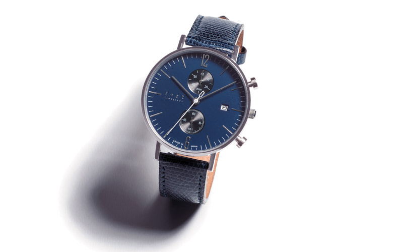 好みに合わせ、フェースとストラップを選べる〝Knot〟の時計。その魅力を生かし、ALLネイビーの腕時計をオーダーしました。フェースは、トラッドさと視認性のよさで人気の2カウンタークロノグラフ、ベルトは艶のあるリザードレザーをチョイス。ネイビーだから男前に寄りすぎず、レザーバングルのような感覚で手元を品よく知的に彩れます。国産ならではの精巧なつくりも、大人のこだわりポイント!