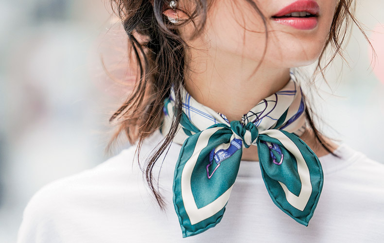 首元で結ぶとちょうどいいボリューム。スカーフ¥11,000(フラッパーズ〈マニプリ〉)イヤリング[片耳]¥7,700(マユ アトリエ〈マユ〉)カットソー¥10,000(ゲストリスト〈アッパーハイツ〉)